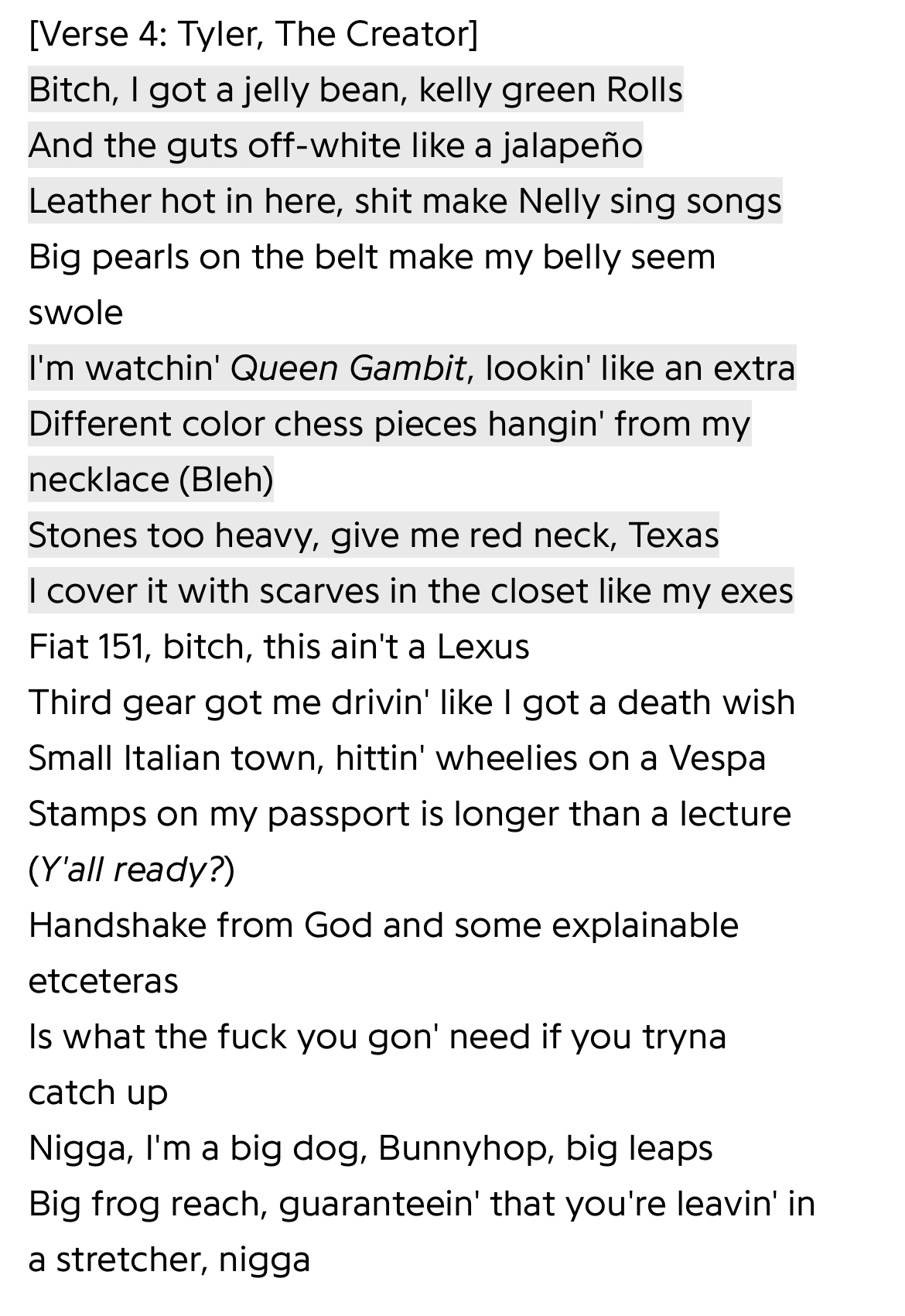 Speaking of: “STUNTMAN” is undeniably top five Tyler. I love it when Vince Staples features on other tracks because his own beats are often meh. The second verse is Tyler’s best, full stop. If you don’t believe me, read it and weep.